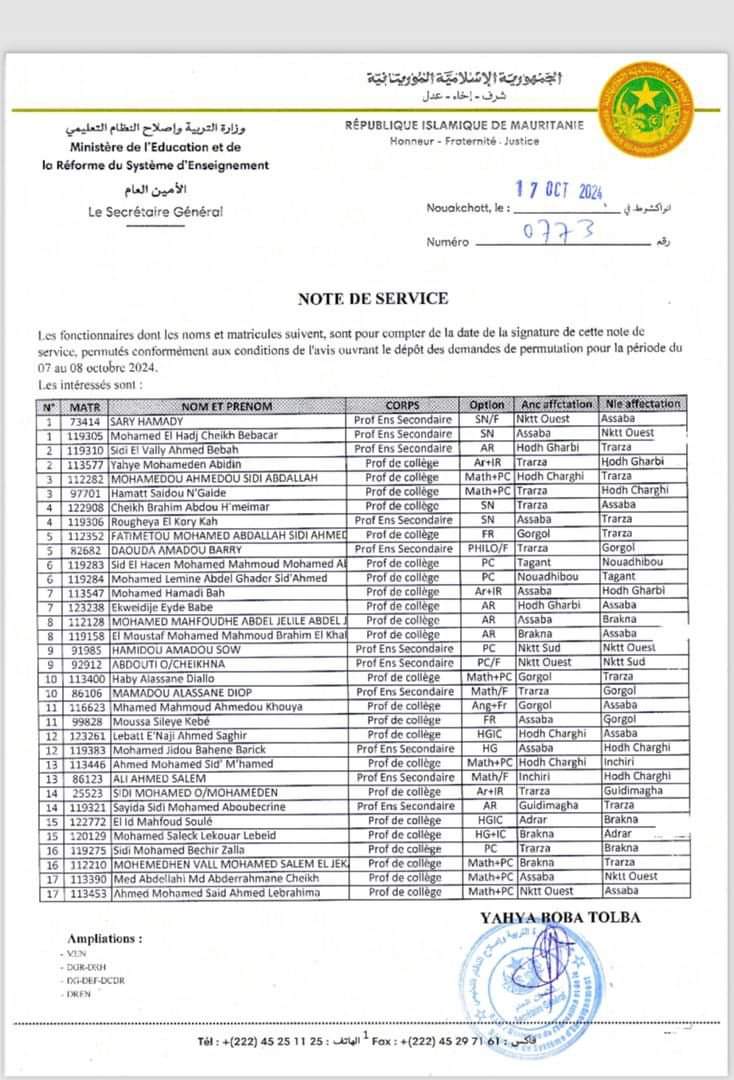 أجرت الإدارة العامة للأمن الوطني اليوم مجموعة من التعيينات والمبادلات في صفوف المديرين ورؤساء المفوضيات،وجاء على راس هذه التعبنات تعيين المفوض الرئيس عبد الفتاح حباب مديرا جهويا لامن ولاية الترارزة ،ومن ضمن التعيينات :