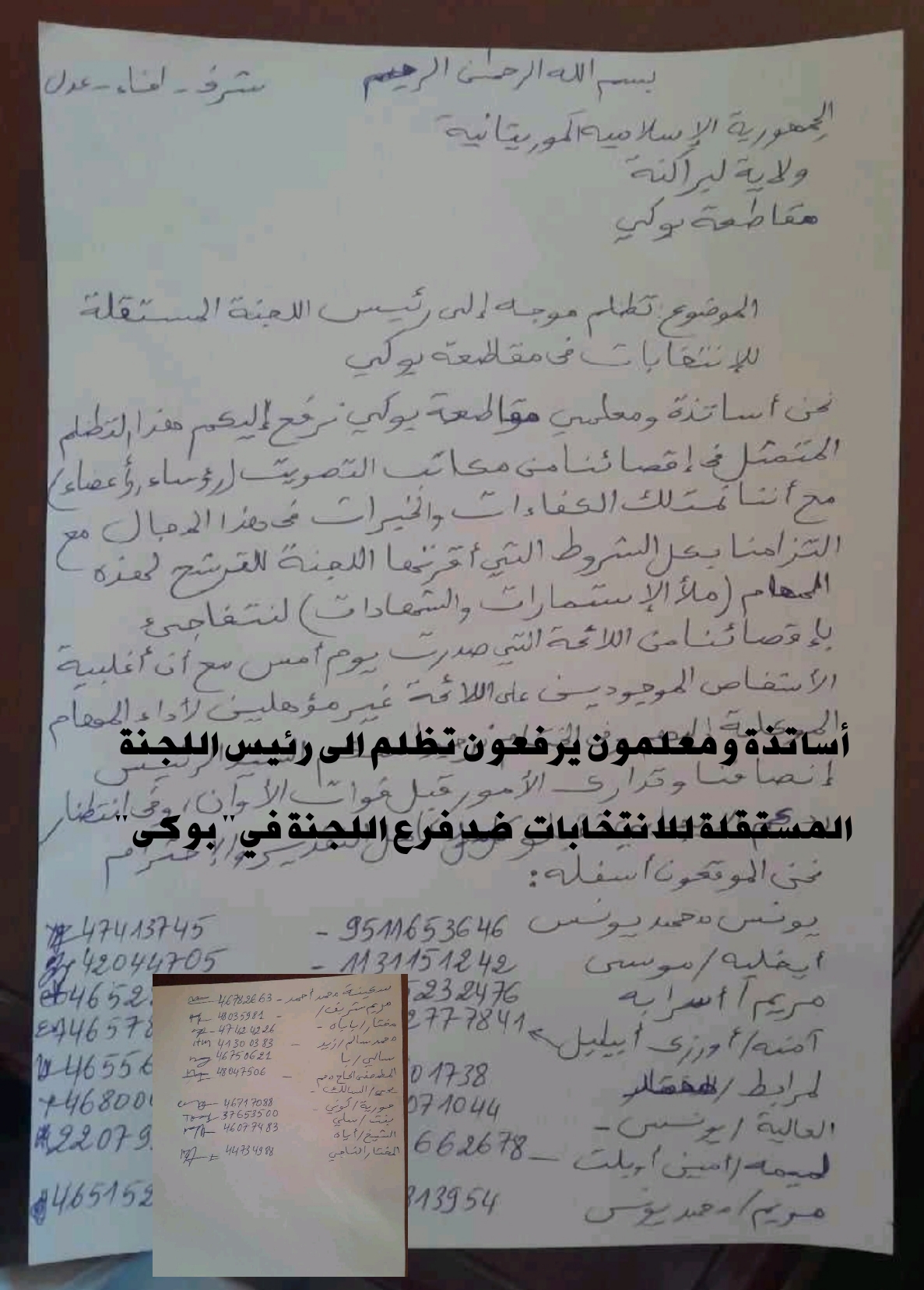 الحوادث-وقع مجموعة من الأساتذة والمعلمين في بوكي بولاية لبراكنة على رفع تظلم يعبرون فيه عن تبرهم،واستيائهم من إقصائهم من المشاركة في رئاسة مكاتب التصويت،وتفاجؤوا من حرمانهم الغير مبرر،رغم ان لديهم جميع المواصفات والمؤهلات المطلوبة في الإستمارة التي ملأوها.