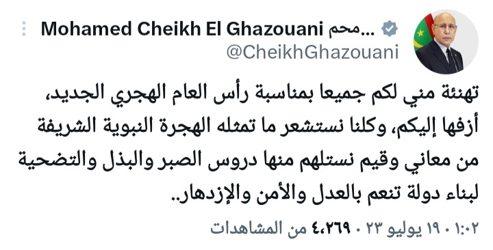 هنأ رئيس الجمهورية السيد محمد ولد الشيخ الغزواني عبر تغريدة نشرها حسابه الرسمي على منصة اتويتر الشعب والأمة الإسلامية بمناسبة العام الهجري الجديد.