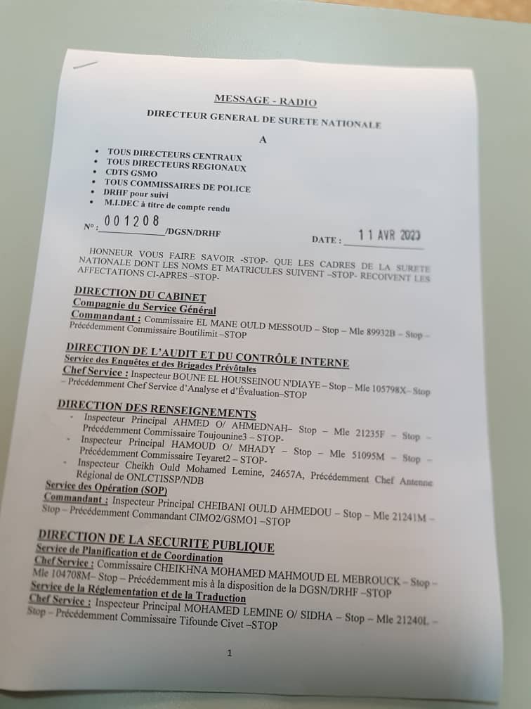 اجرت الإدارة العامة للأمن تحويلات واسعة بين المفوضيات في الإدارات الجهوية للامن العمومي،وكذلك في المصالح بالإدارة العامة للامن.وقد طالت التحويلات مفتشي الشرطة الخريجين حديثا والذين كانوا في مرحلة تربص بين المفوضيات بنواكشوط.