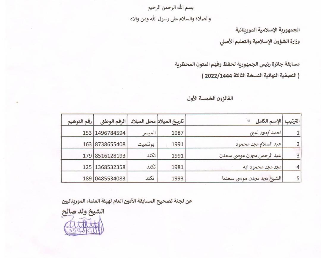 وجاء ترتيب الفائزين، حسب القائمة النهائية الموقعة من طرف رئيس لجنة تصحيح المسابقة الشيخ ولد صالح، على النحو التالي: