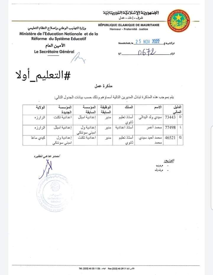 الحوادث- تم بموجب مذكرة تعديل موقعة من طرف الأمين العام لوزارة التهذيب الوطني بتاريخ يوم امس الجمعة تحويل محمد احيد سيدي محمد استاذ ثانوية من إدارة إعدادية تكنت الى اعدادية ولد ابني سوننكي بولاية كيدي ماغه،ليحل محله مدير لاعدادية تكنت سيدي ولد اليدالي استاذ تعليم ثانوي.