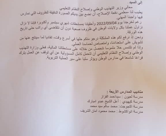 طالبت مجموعة معلمي "دفعة الاصلاح" وزارة التهذيب الوطني بدفع رواتبهم المتأخرة لازيد من شهرين ، وجاء في رسالة وجهوها الى وزير التهذيب: