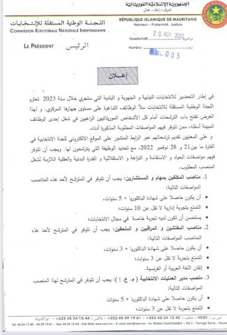 وأعلنت اللجنة فتح باب الترشحات أمام كل الأشخاص الموريتانيين الراغبين في شغل إحدى الوظائف المبينة أسفله، ممن تتوفر فيهم المواصفات المطلوبة المذكورة أدناه.