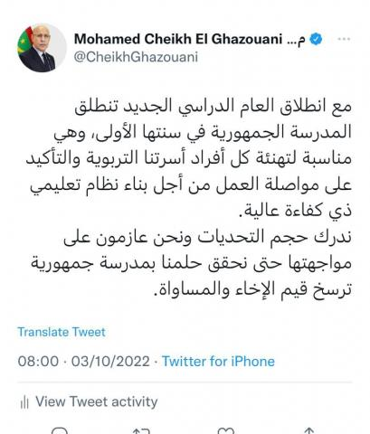 وأضاف في تغريدة له صباح اليوم بمناسبة افتتاح العام الدراسي الجديد 2022/2023، أنه، مع انطلاق العام الدراسي الجديد تنطلق المدرسة الجمهورية في سنتها الأولى.