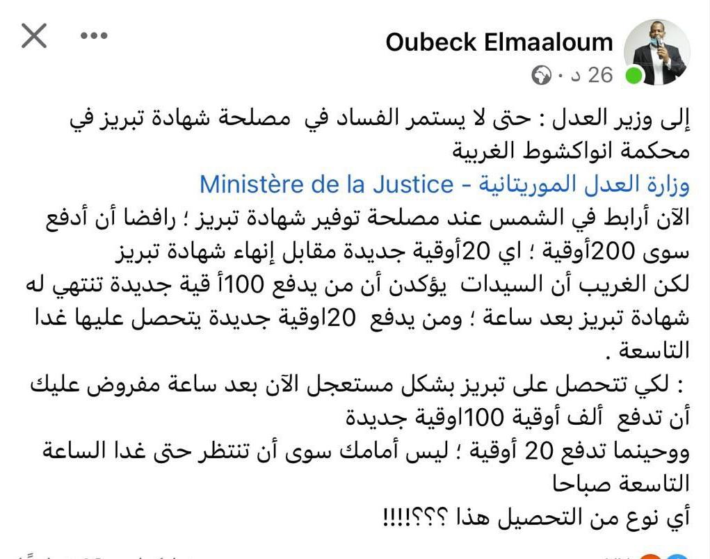 وذلك اعتمادا على تدوينة كتبها المدون العلوم ولد أوبك تحت عنوان:(إلى وزير العدل :حتى لا يستمر الفساد في مصلحة شهادة التبريز في محكمة ولاية نواكشوط الغربية)حول ماقال في عرضهن عليه تسريع إجراءات الحصول على شهادة تبريز مقابل دفع 1000 أوقية بدل 20 أوقية قديمة.
