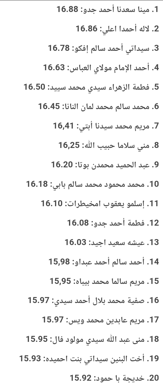 وحلت في الرتبة الثانية التلميذة لاله أحمدا اعلي بحصولها على معدل: 16.86، فيما حل ثالثا التلميذ سيداتي أحمد إفكو بحصولها على معدل: 16.78.