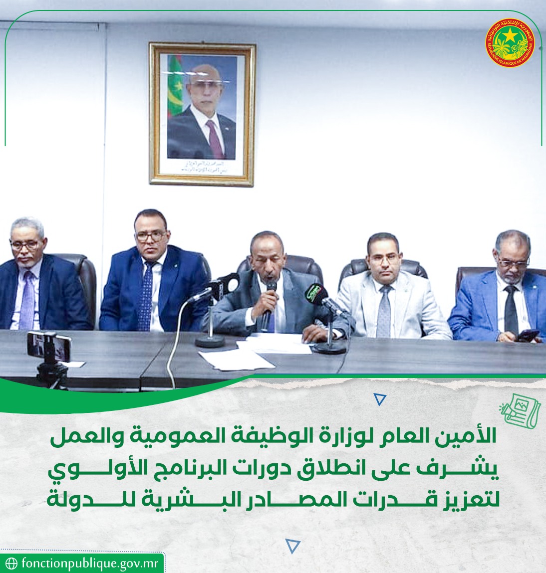 أشرف الأمين العام لوزارة الوظيفة العمومية والعمل، السيد البكاي ولد عبد القادر ولد الخو، صباح اليوم الجمعة 25 يوليو 2025، بمقر المدرسة الوطنية للإدارة والصحافة والقضاء، على انطلاق دورات البرنامج الأولوي لتعزيز قدرات المصادر البشرية، الموجه لبعض موظفي ووكلاء القطاعات الوزارية التي خضعت لتقييم مسبق.