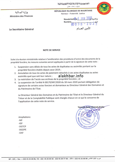 وبموجب هذا التعليق الوارد في المذكرة التي وقعها الأمين العام للوزارة يعقوب ولد أحمد عيشة، لم يعد لدى مدير إدارة العقارات صلاحية يوقع أي وثيقة عقارية.
