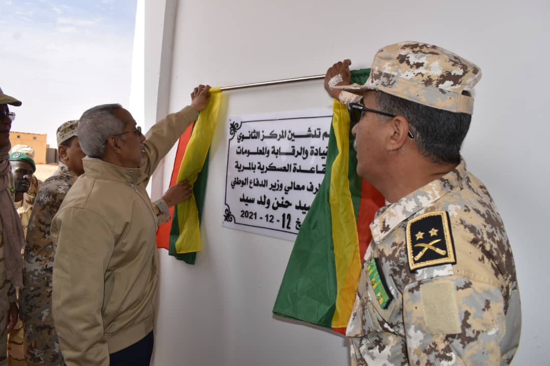 اشرف وزير الدفاع حننا ولد سيدي في قاعدة"لمرية" شمال البلاد على تدشين منشآت بعضها يتعلق بتوفير الطاقة تتمثل في محطة للتزويد بالطاقة الشمسية،وكذلك مدرجا وعنابر للطائرات ،وتدخل التعزيزات في إطار الخطة الخمسية 2020 – 2024 لوزارة الدفاع، الرامية إلى تحسين أداء وظروف أفراد القوات المسلحة من أجل القيام بمهامها.