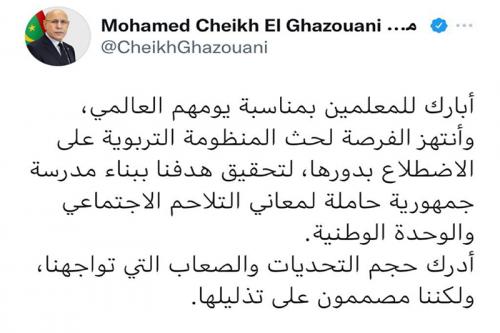 "أبارك للمعلمين بمناسبة يومهم العالمي، وأنتهز الفرصة لحث المنظومة التربوية على الاضطلاع بدورها، لتحقيق هدفنا ببناء مدرسة جمهورية حاملة لمعاني التلاحم الاجتماعي والوحدة الوطنية.