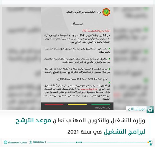 ألعن ن وزارة التشغيل والتكوين المهني، في اعللن صادر عنها، عن موعد، إطلاق برامج التشغيل سنة 2021 من 14 يونيو إلى 5 يوليو 2021، سيتم فتح الترشحات لبرامج مكونة التشغيل في برنامج أولوياتي الموسع لرئيس الجمهورية والتي تنفذها وزارة التشغيل والتكوين المهني.