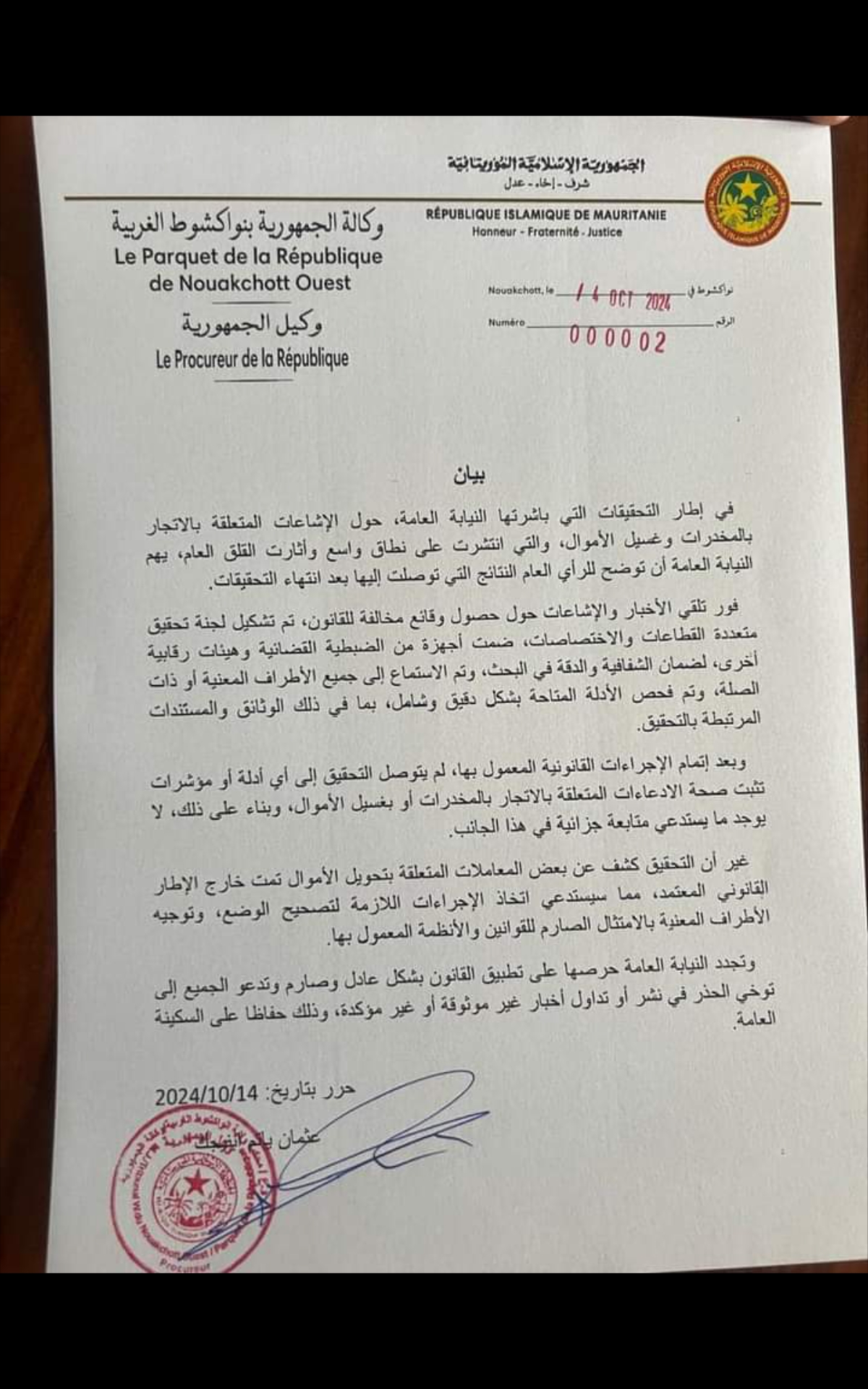 أعلنت النيابة العامة في موريتانيا، عقب تحقيقاتها في الإشاعات التي تداولت مؤخراً بشأن الاتجار بالمخدرات وغسيل الأموال، أنها لم تجد أي أدلة تؤكد صحة هذه الادعاءات.