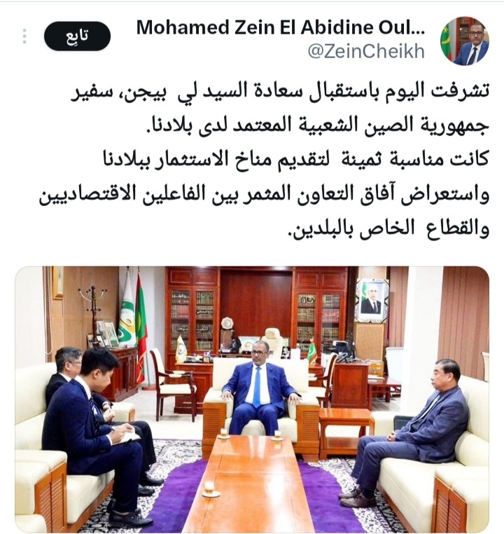 أكد رئيس اتحاد أرباب العمل الموريتانيين السيد محمد زين العابدين الشيخ أحمد في تغريدة نشرها أمس عبر حسابه على تويتر "أنه استقبل سعادة السيد لي بيجن، سفير جمهورية الصين الشعبية" المعتمد بموريتانيا.