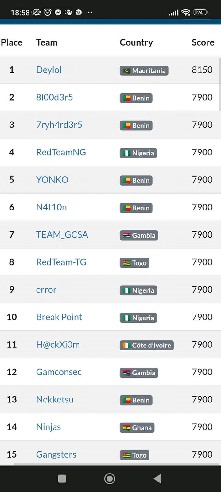 وجاء هذا التأهل بعد تصدر الفريق التصفيات المؤهلة لبطولة مجموعة دول غرب إفريقيا "إيكواس" للأمن السيبراني إذ حصل على مجموع نقاط بلغ 8150 نقطة، محققا بها المركز الأول في تصفيات البطولة، وبفارق 250 نقطة عن أقرب الملاحقين له.