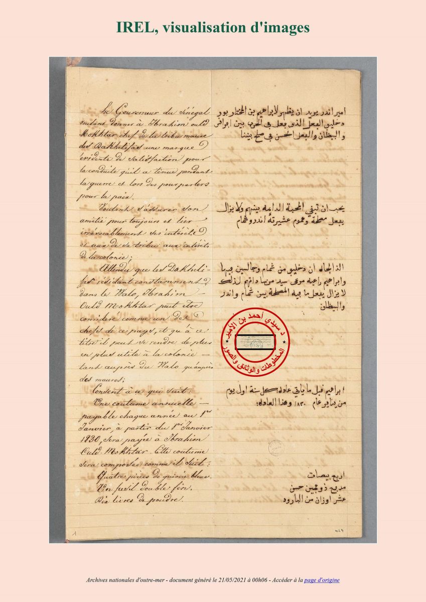 وفي المقابل يلتزم الزعيم إبراهيم بالترتيبات التي تطلب منه الإدارة الفرنسية بخصوص عبور من هم تحت سلطته بين الضفتين وغير ذلك من الترتيبات واللوائح. وإذا لم يلتزم بذلك تصبح الاتفاقية لاغية.