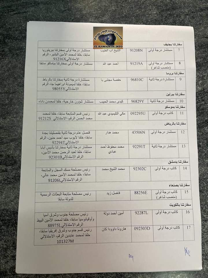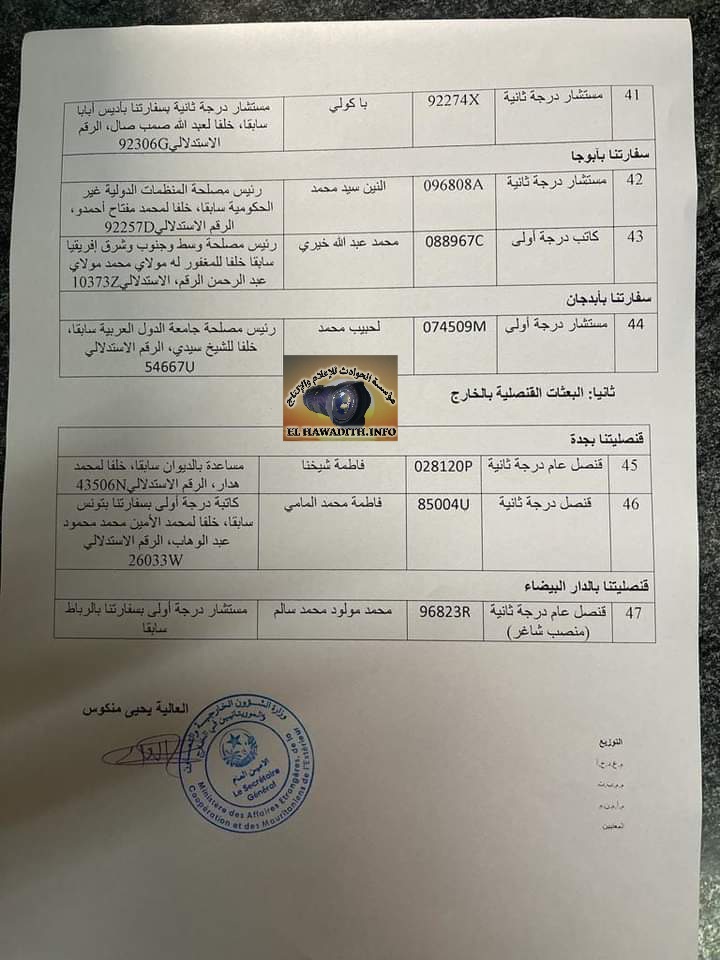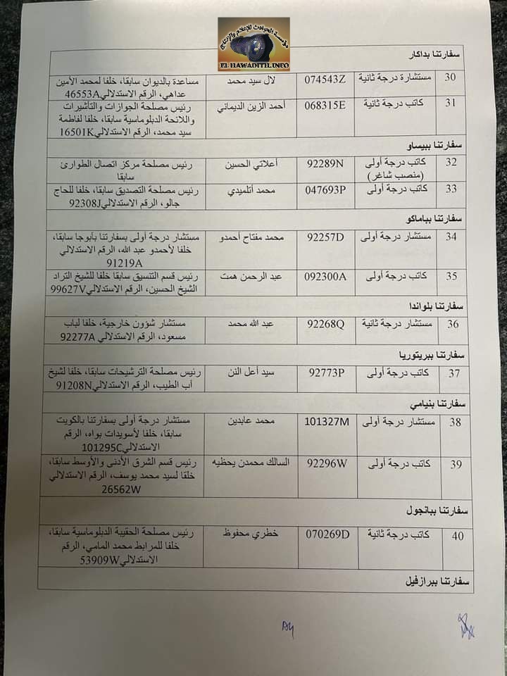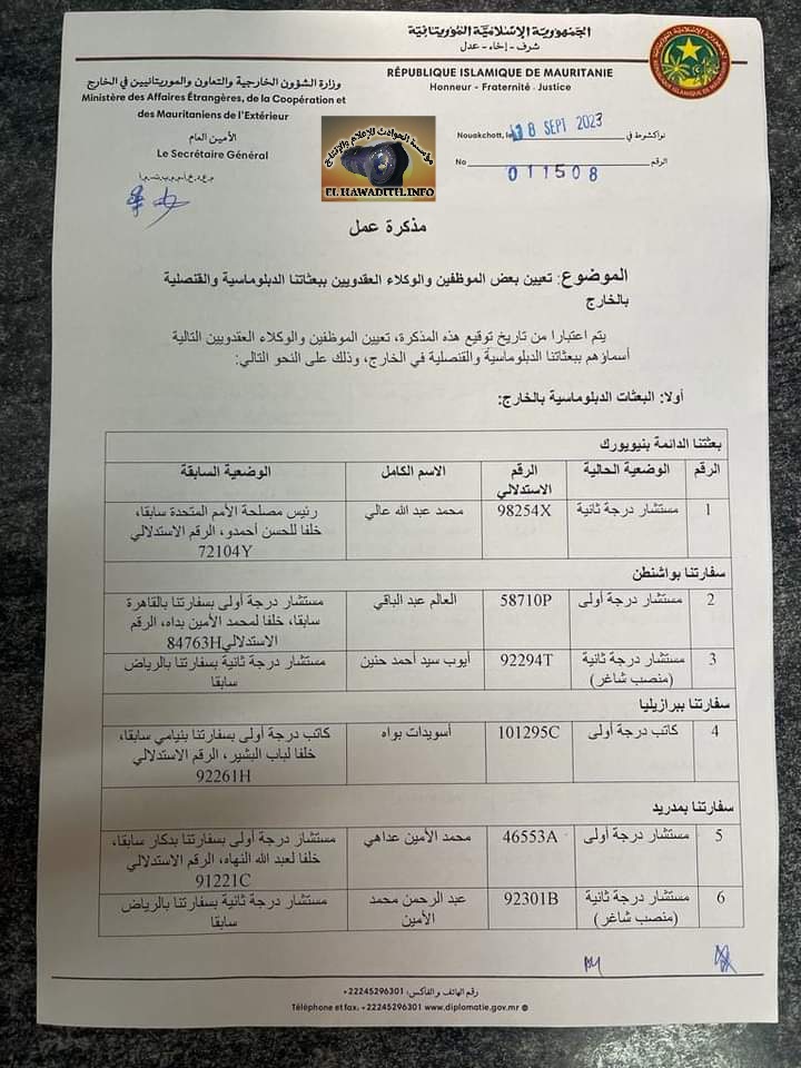 بموجب مذكرة عمل وقعتها الأمينة العامة لوزارة الشؤون الخارجية والتعاون والموريتانيين في الخارج تم إجراء تغييرات واسعة في المستشارين الدبلوماسيين في السفارات والقنصليات الموريتانية في الخارج.