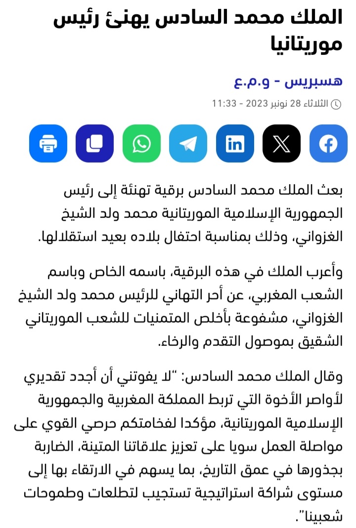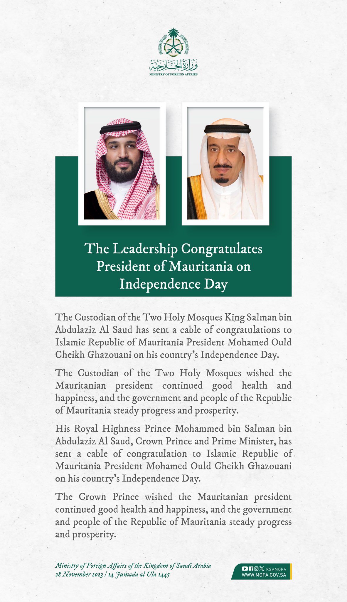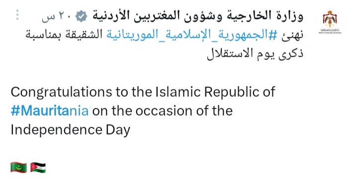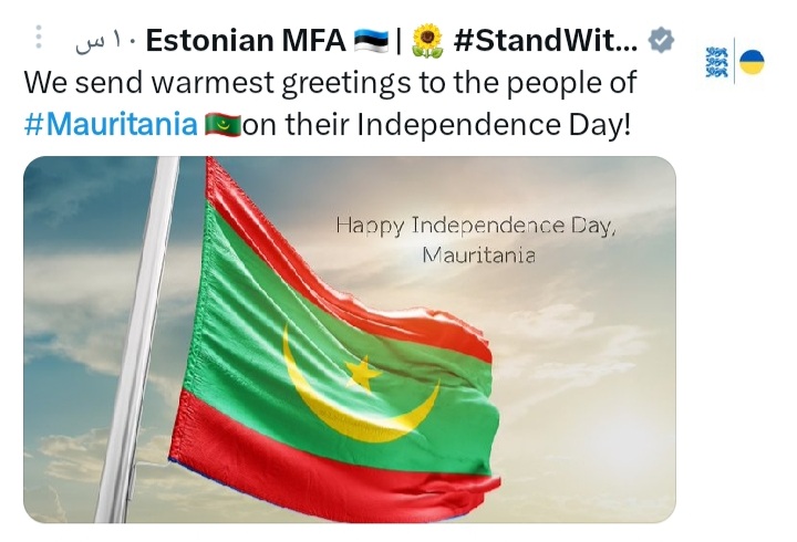 الحوادث - أعربت عدد من الدول والهيئات عبر رسائل، وتغريدات، تهنئتها لموريتانيا بمناسبة ذكرى عيد الاستقلال الوطني.