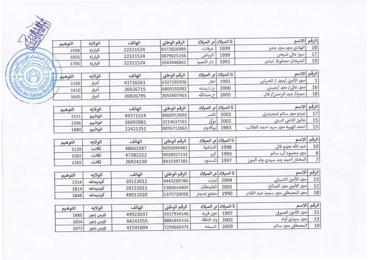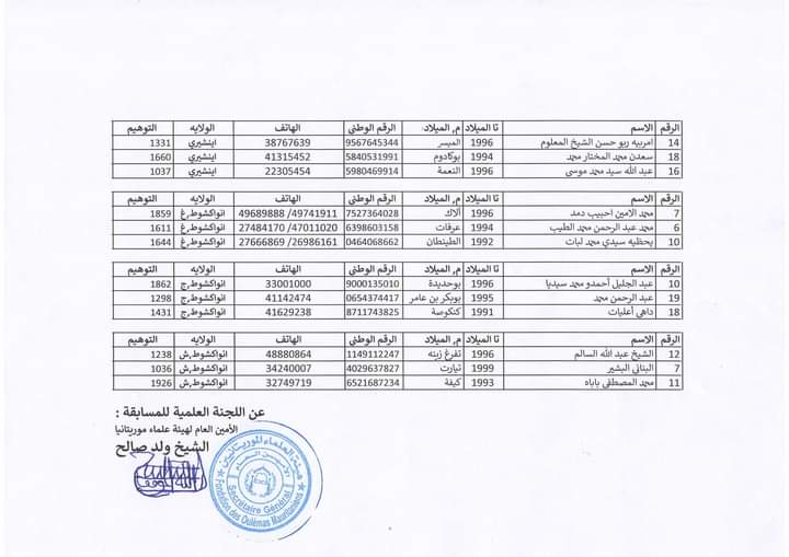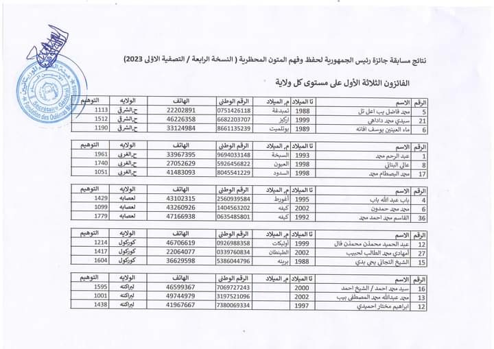 الحوادث- أعلنت وزارة الشؤون الإسلامية والتعليم الأصلي مساء أمس الأربعاء نتائج التصفية الأولى من مسابقة جائزة رئيس الجمهورية لحفظ وفهم المتون المحظرية (النسخة الرابعة).