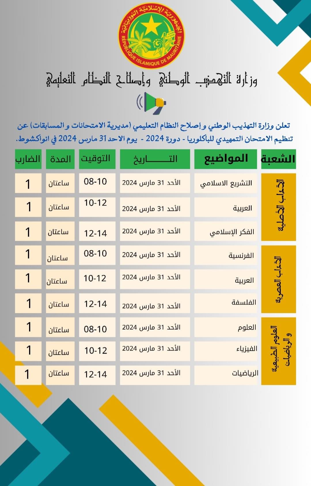 الحوادث - حددت وزارة التهذيب الوطني وإصلاح النظام التعليمي، موعدا لإجراء الامتحان التمهيدي للباكالوريا 2024 في نواكشوط.