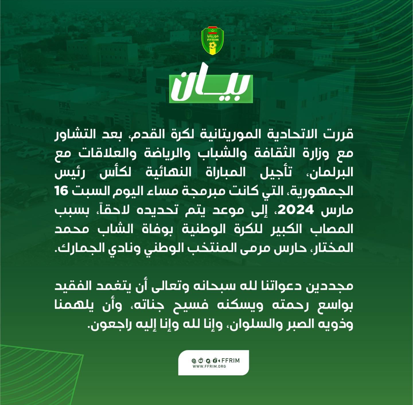 وذكرت الاتحادية أن هذا التأجيل جاء بعد الاتفاق بين الاتحادية ووزارة الثقافة، بناء على الخبر المحزن الذي خيم على أجواء كرة القدم الوطنية بوفاة حارس نادي الجمارك والمنتخب الوطني للآمال، الشاب محمد المختار، صباح اليوم بنواكشوط.