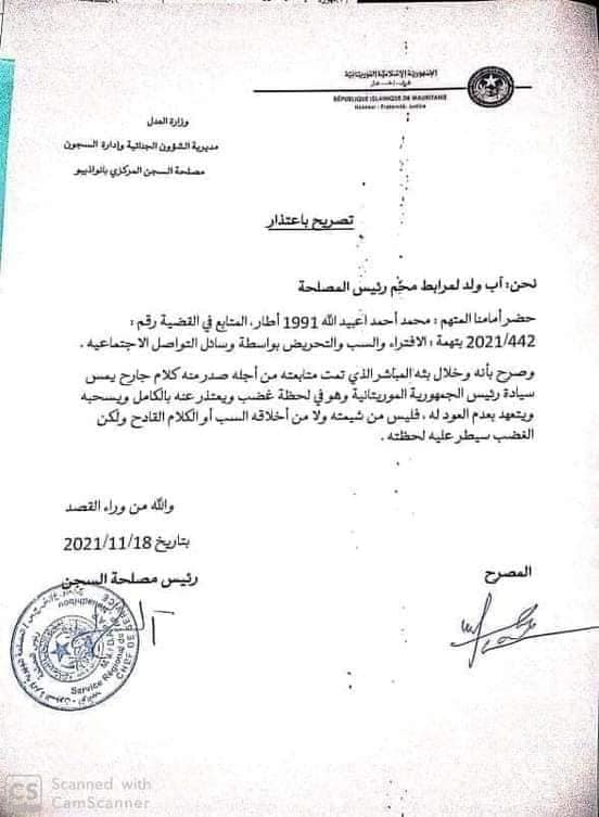الحوادث - أصدر رئيس مصلحة السجن بنواذيبو وثيقة باعتراف واعتذار المدون محمد أحمد اعبيد الله، باساته على صفحته في التواصل الاجتماعي على شخص رئيس الجمهورية