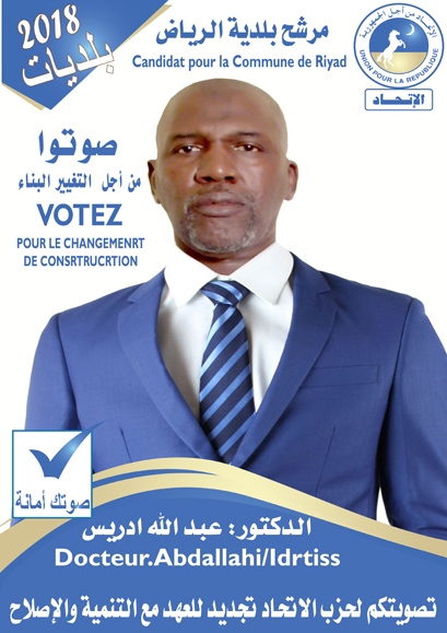 من المميزات التي طبعت ترشحات الحزب الحاكم (الاتحاد من أجل المجمهورية في هذه الانتخابات اختياره للكفاءة والنزاهة، حيث وقع اختياره على أكادميين من خيرة أساتذة الجامعة لتقديمهم على رأس لوائحه الانتخابية.. فاختار ضمن مرشحيه للبلدية الدكتور والباحث والأستاذ في جامعة انواكشوط العصرية عبد الله أدريس على رأس لائحة بلدية مقاطعة الرياض.