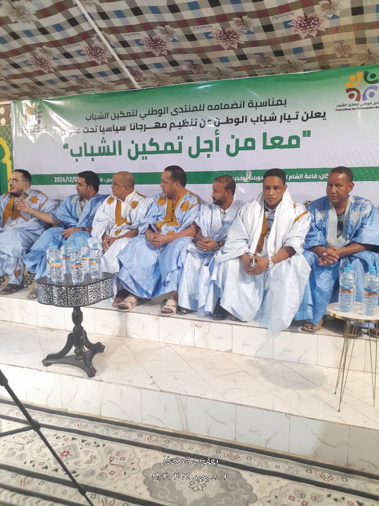 الحوادث_نظم تيار شباب الوطن تجمعًا جماهيريًا حاشدًا مساء أمس في مقره بمقاطعة توجنين، حيث أعلن انضمامه إلى كتلة المنتدى الوطني لتمكين الشباب، في خطوة تهدف إلى تعزيز الحضور الشبابي في الساحة السياسية ومواكبة رؤية رئيس الجمهورية محمد ولد الشيخ الغزواني لتمكين الشباب.