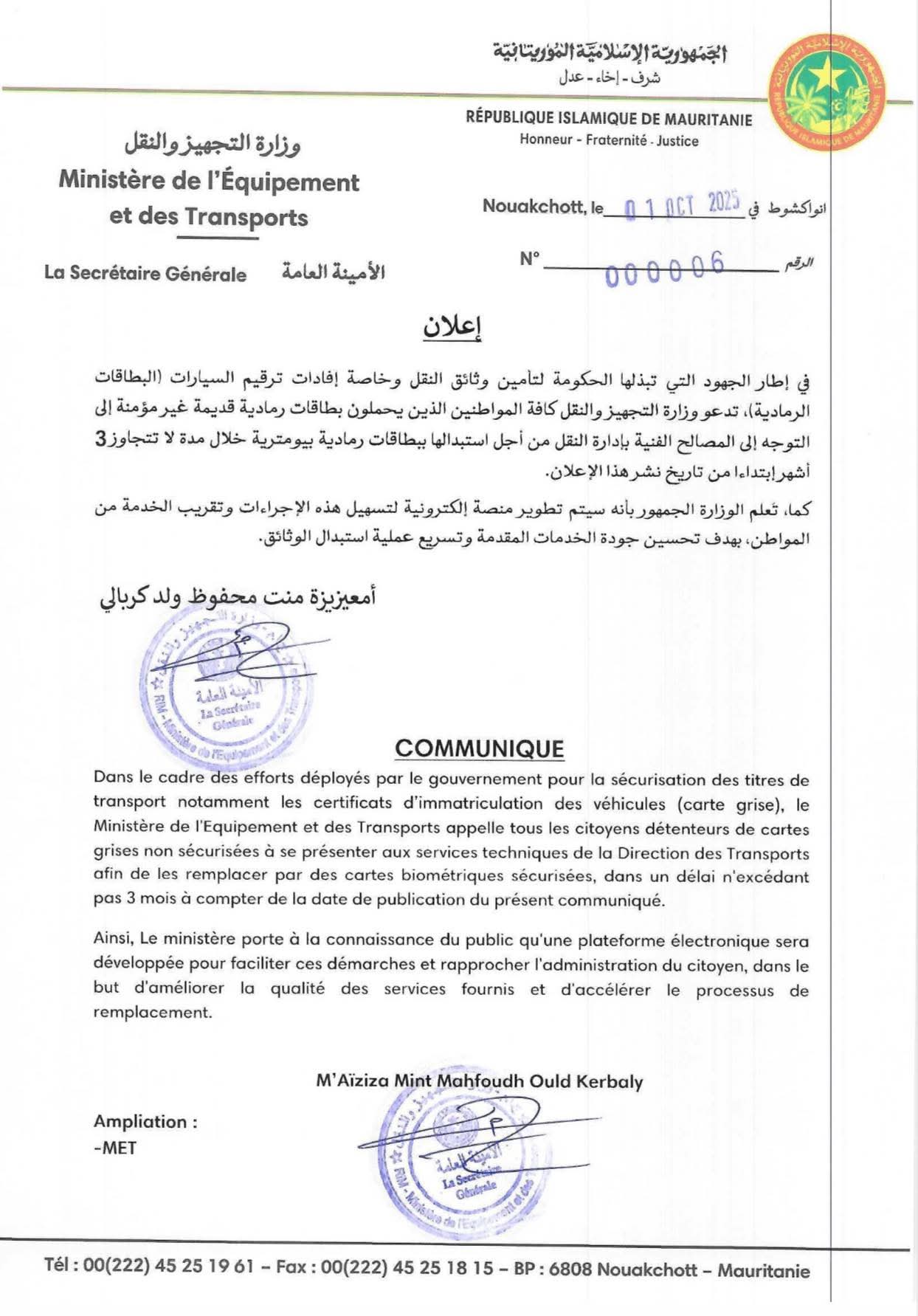 دعت وزارة التجهيز والنقل، في بيان صادر اليوم، المواطنين إلى استبدال البطاقات الرمادية غير المؤمنة بأخرى بيومترية، وذلك في أجل أقصاه ثلاثة أشهر.