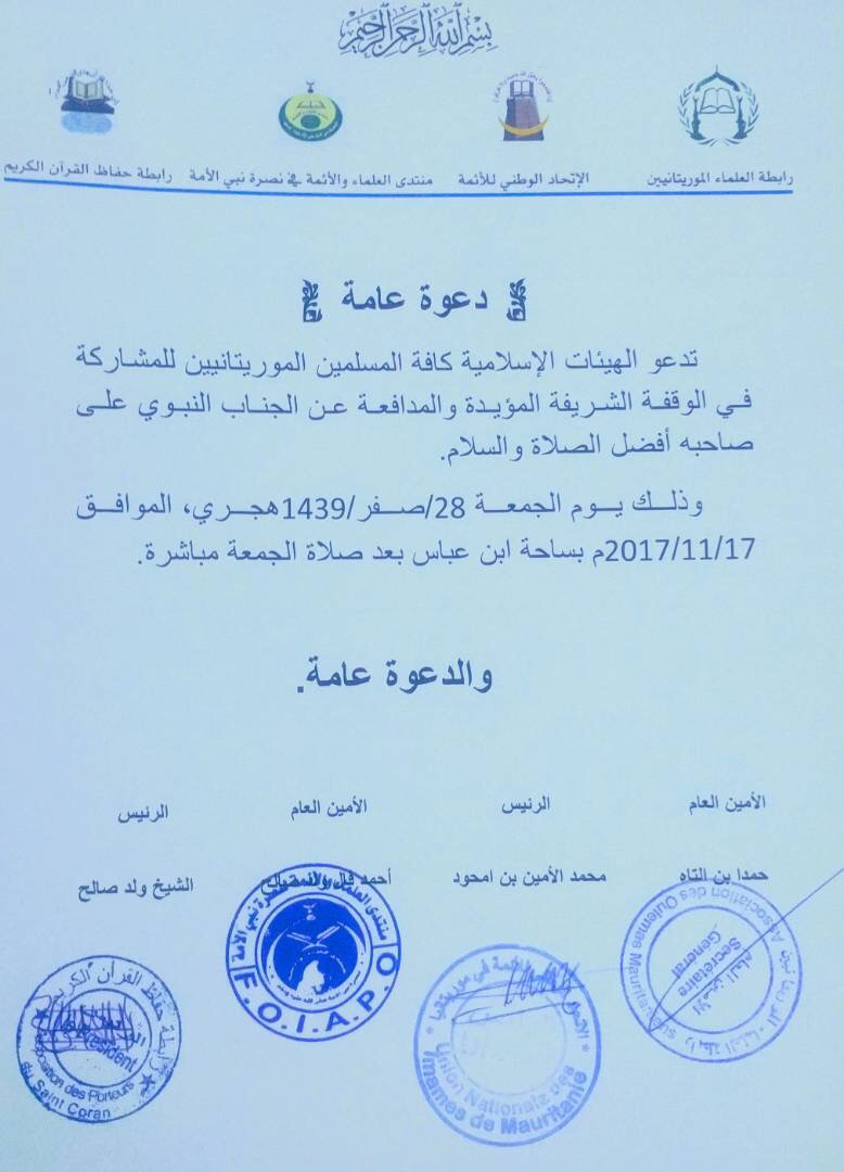 وافقت السلطات الإدارية في موريتانيا بناء على ترخيص بالموافقة لهيئات إسلامية تنظيم وقفة للدفاع عن الجانب النبوي وتأيد القرار الذي صدر من السلطات العليا يوم أمس في موضوع تعديل المادة ٣٠٦، والذي من المقرر أن تنظم في ساحة مسجد ابن عباس.